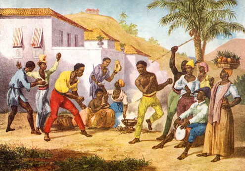Capoeira (pronounced “cap-o-wearah”) is an extraordinary and unique martial art that finds its origins among the African slaves in Brazil. It combines self-defense, acrobatics, dance, music and song. Its martial aspects began developing in the 16th and 17th centuries, as a means of protection by the slaves from their owners. It was consequently banned, and became hidden in a dance; it was ‘played’ within a circle of onlookers and musicians using percussive and stringed instruments- primarily the berimbau, a stringed bow-like instrument from Angola. It was in the circle (a roda in Portuguese) where highly skilled capoeristas performed their art using a system of kicks, leg sweeps, and flips.